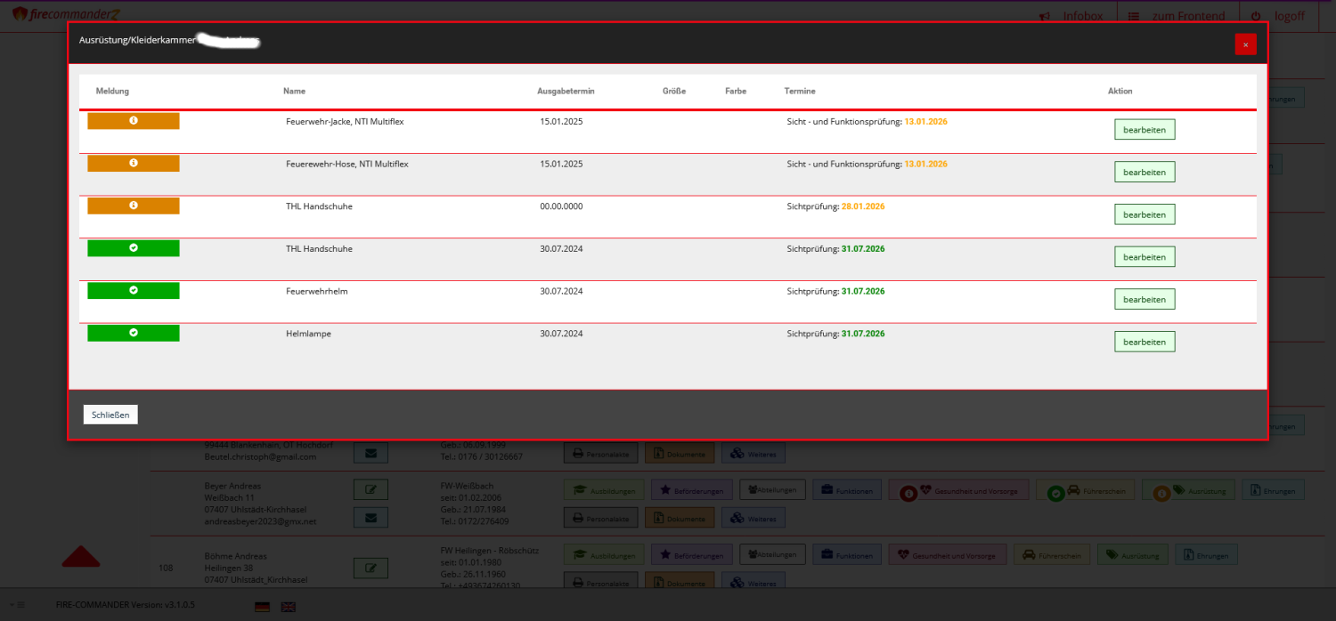 Die persönliche Schutzausrüstung (PSA) jedes Mitglieds wird erfasst und mit Wartungsintervallen oder Austauschzyklen versehen.
