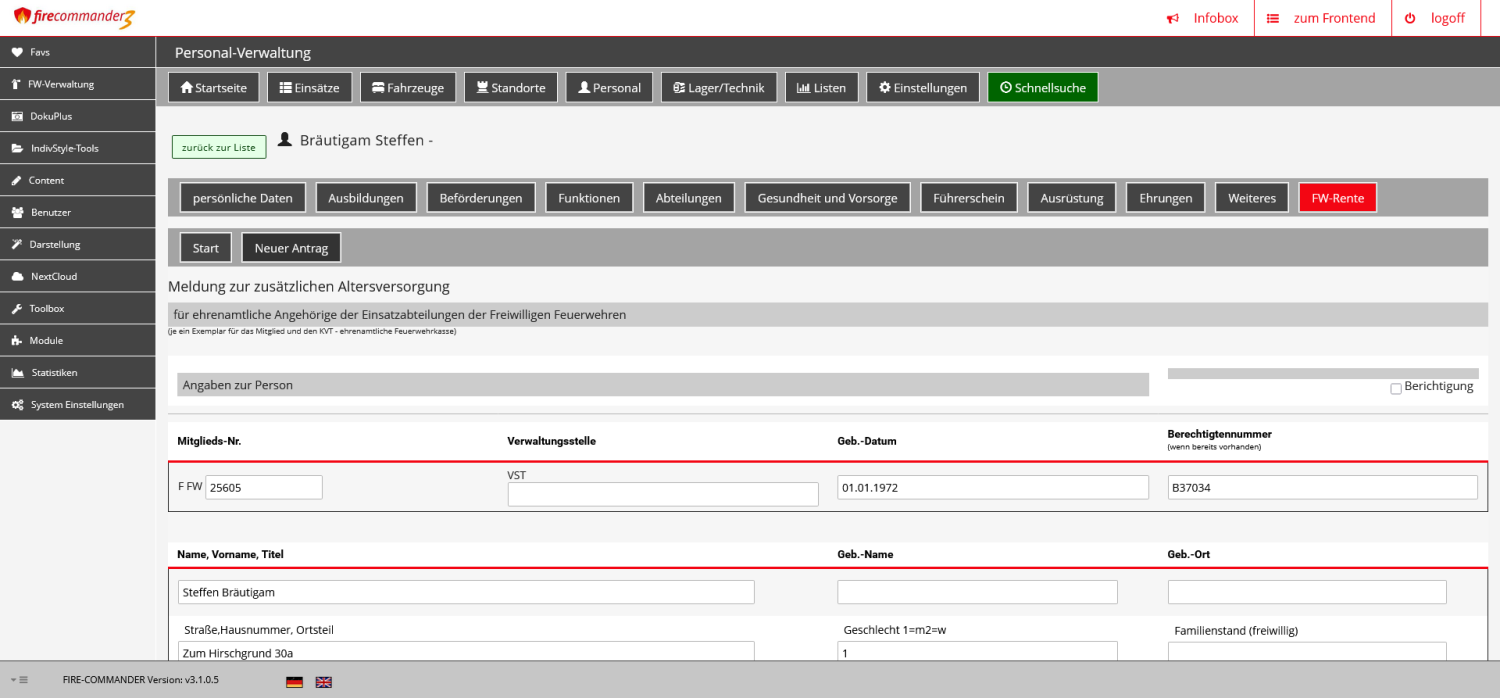 Aus den Personaldaten können Anmeldungen oder Ummeldungen zur Thüringer Feuerwehrrente generiert werden.