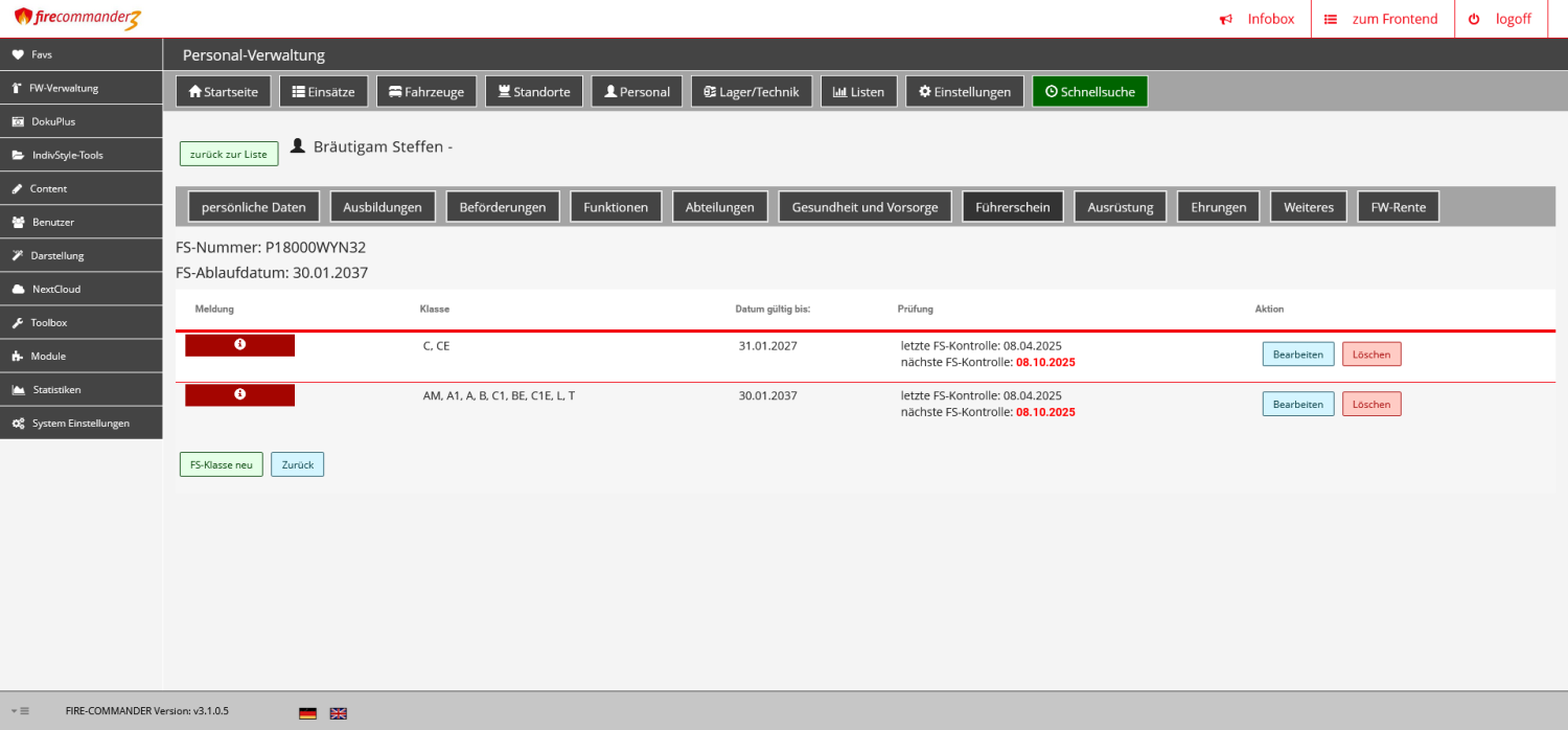 Führerscheindaten können gespeichert und verwaltet werden, inklusive Nachweispflichten für bestimmte Fahrzeugklassen.